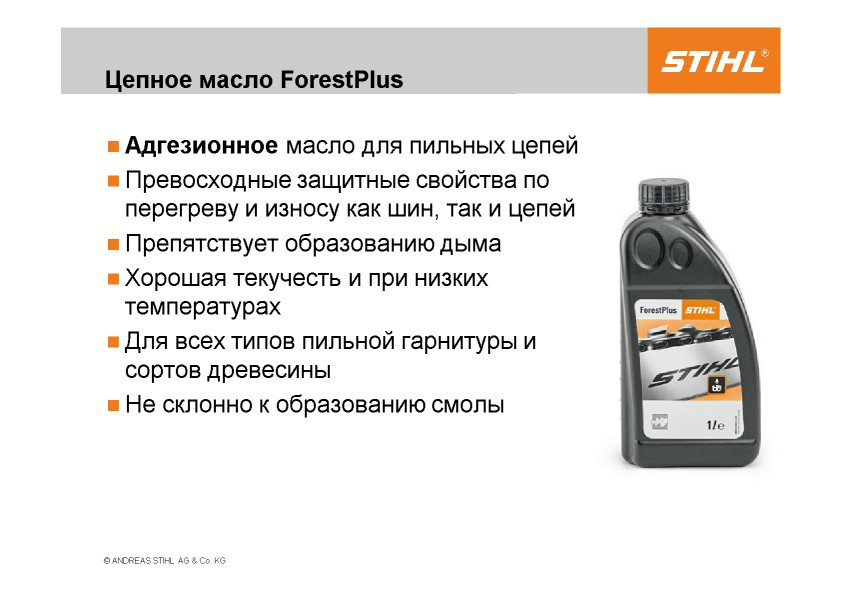 Новое масло STIHL TimberPlus производится с использованием высокоочищенных минеральных масел и высокоэффективного пакета присадок. Имеет отличные адгезионные свойства (тем самым снижается разбрызгивание и расход масла при работе пилы), за счет высоких противоизносных свойств продлевает срок службы пильной цепи, отсутствует осмоление даже при длительном хранении, не теряет своих свойств и позволяет работать при температурах до -40°С