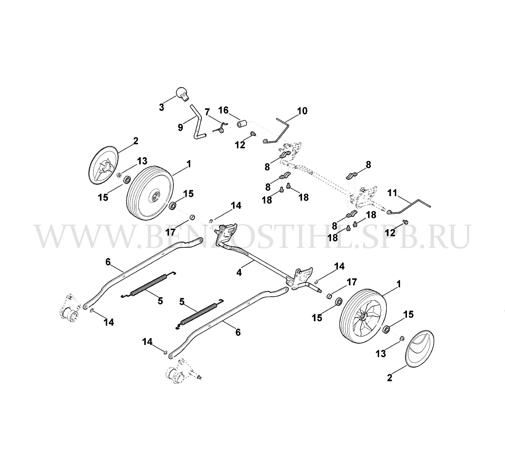 VIKING  Газонокосилка  MB  MB 4.0 RT  Задняя ось, регулировка высоты срезания