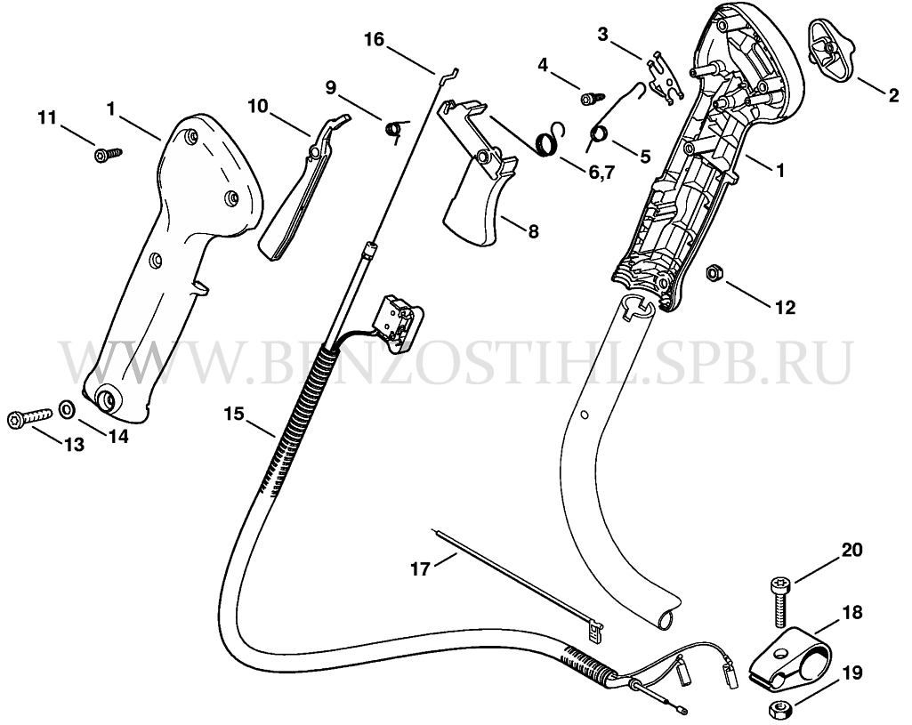 Рукоятка управления в сборе (FS 55, FS 55 C, FS 55 R, FS 55 RC, FS 55 T) (FS 87, FS 87 R) (FS 90, FS 90 R) (MM 55, MM 55 C) (KM 90, KM 90 R) (KM 55, KM 55 C, KM 55 R, KM 55 RC) (HS 81 R, HS 81 RC, HS 81 T, HS 81 TC, HS 86 R, HS 86 T) (FS 220, FS 220 K, FS