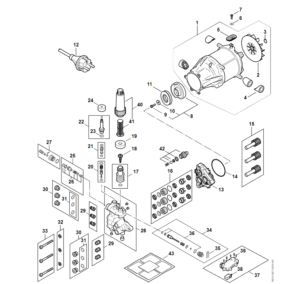 1 | Электродвигатель, Соединительный провод, Клапанный блок, Насос RE 170 | RE 170 | Мойка высокого давления STIHL | Запчасти по России | Сервисное обслуживание