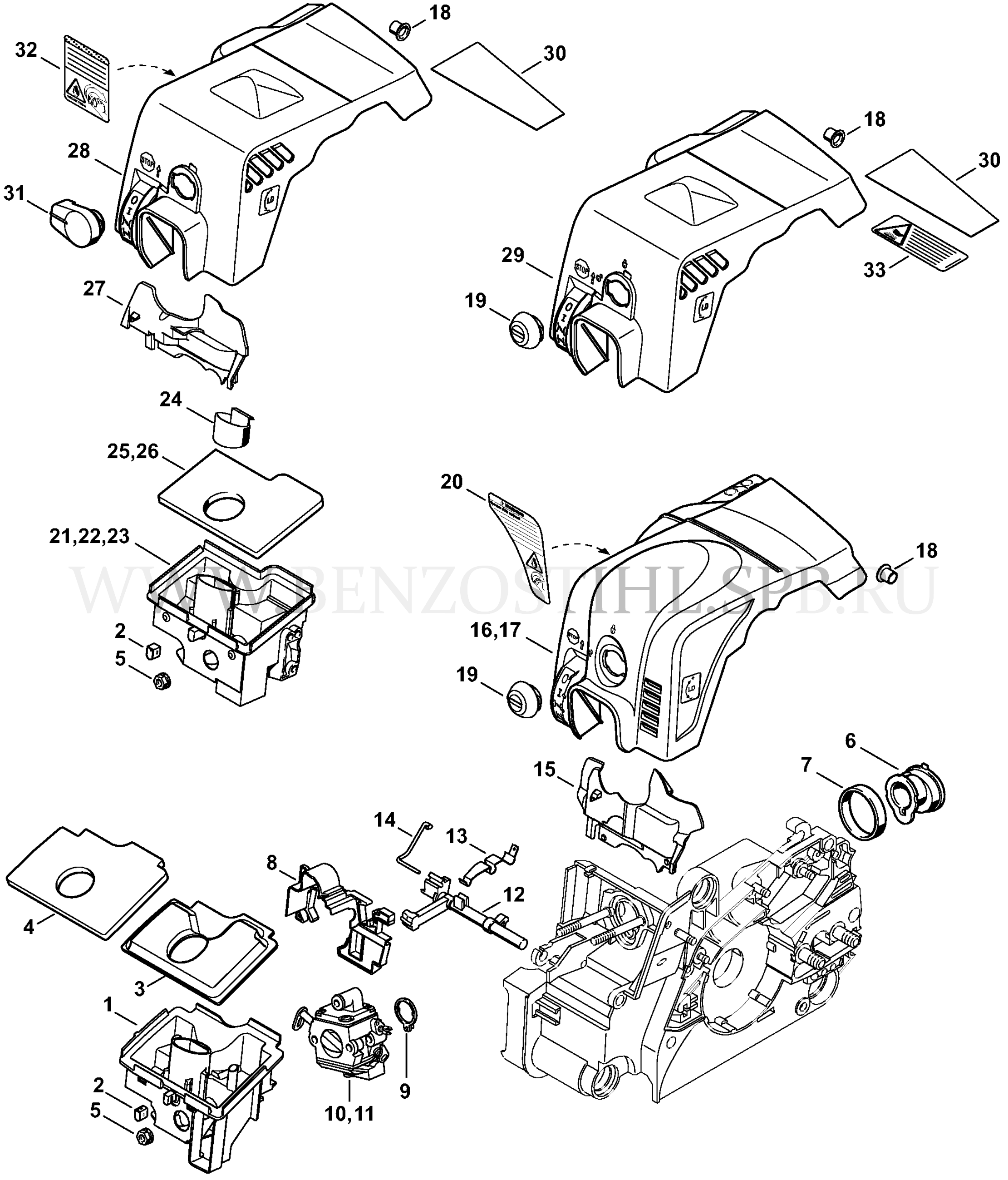 Воздушный фильтр, дефлектор, карбюратор Stihl MS 170, MS 170 C