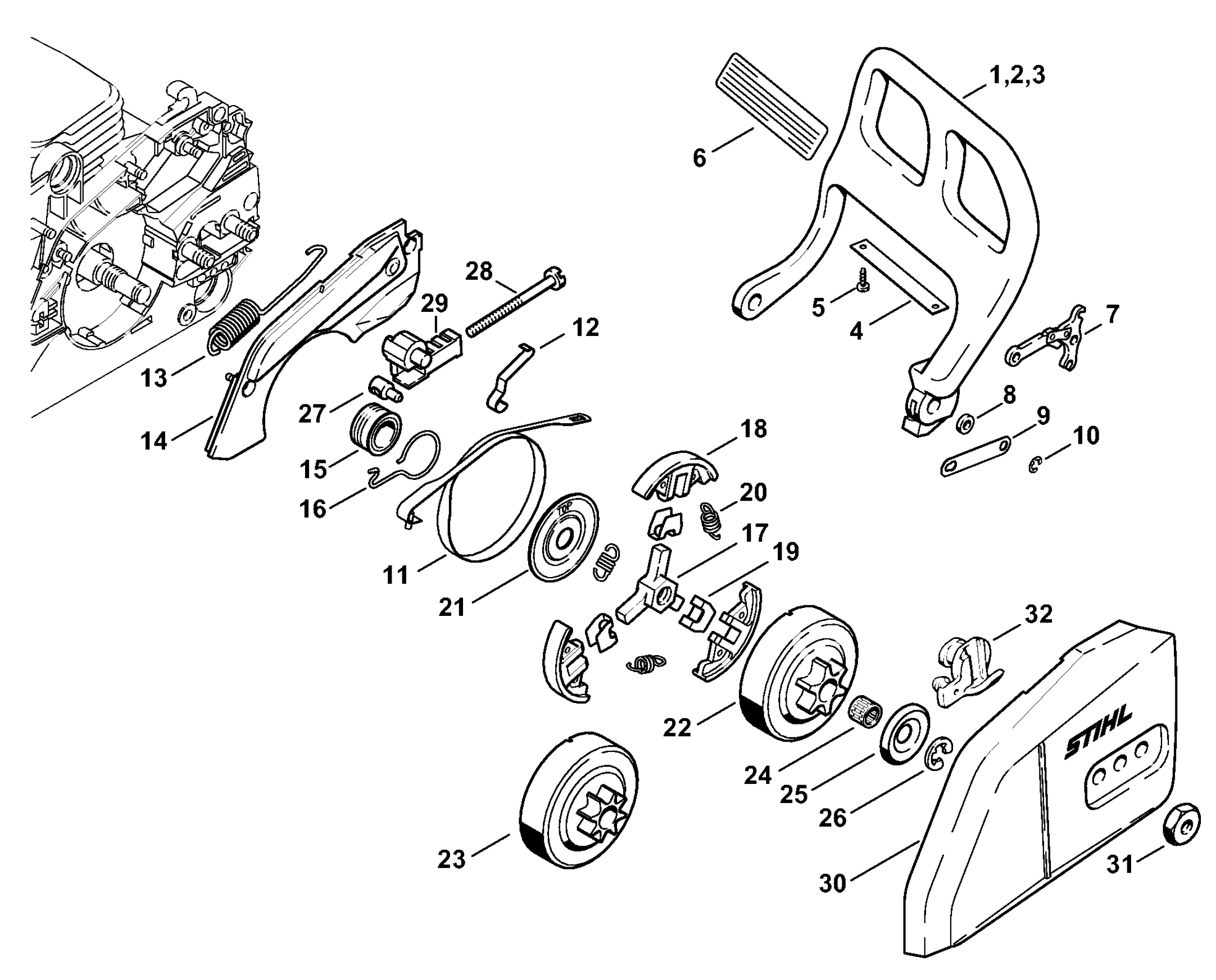 Тормоз пильной цепи, сцепление, звездочка Stihl MS 170, MS 170 C