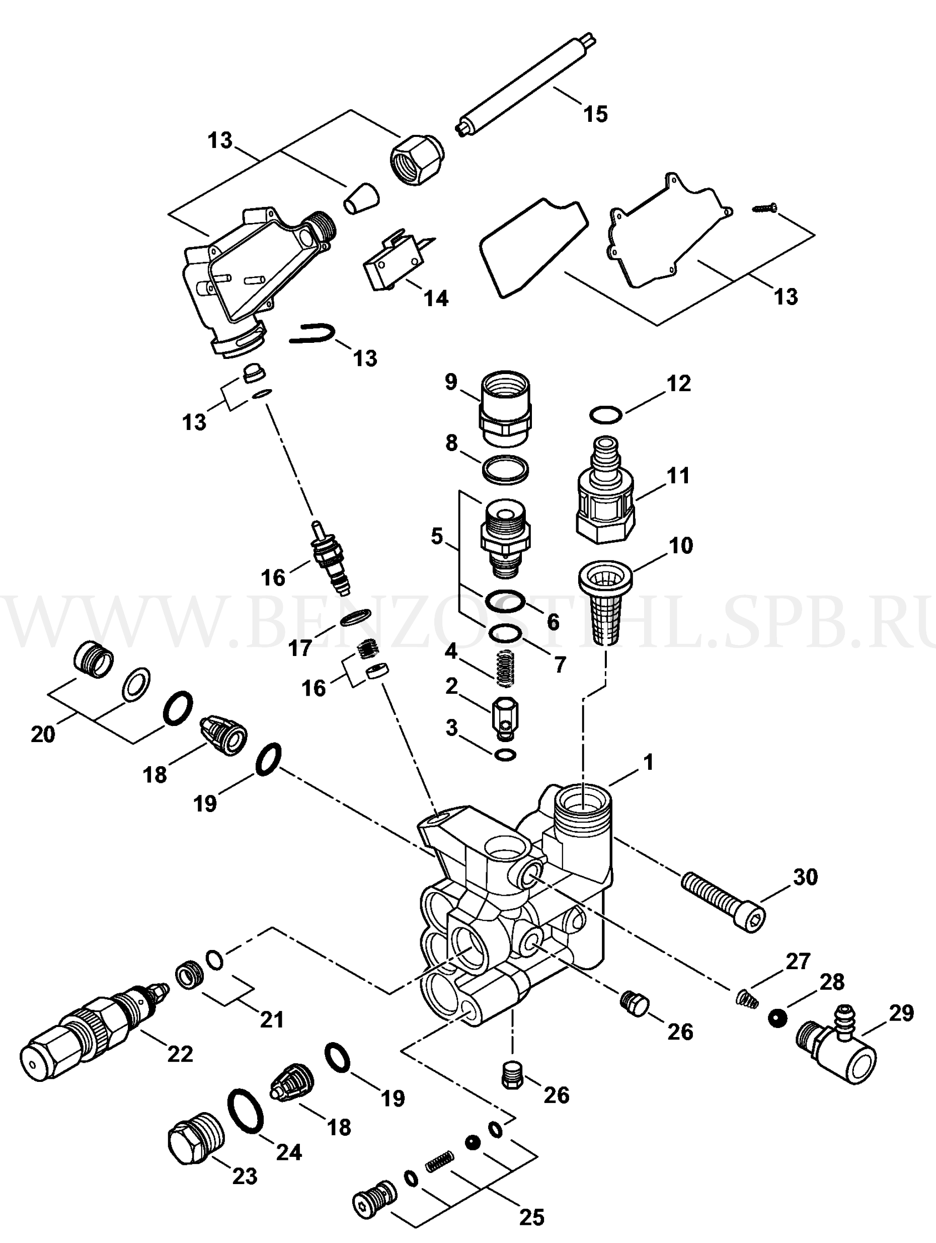 RE 230 Клапанный блок - Распределительный поршень, Присоединение воды