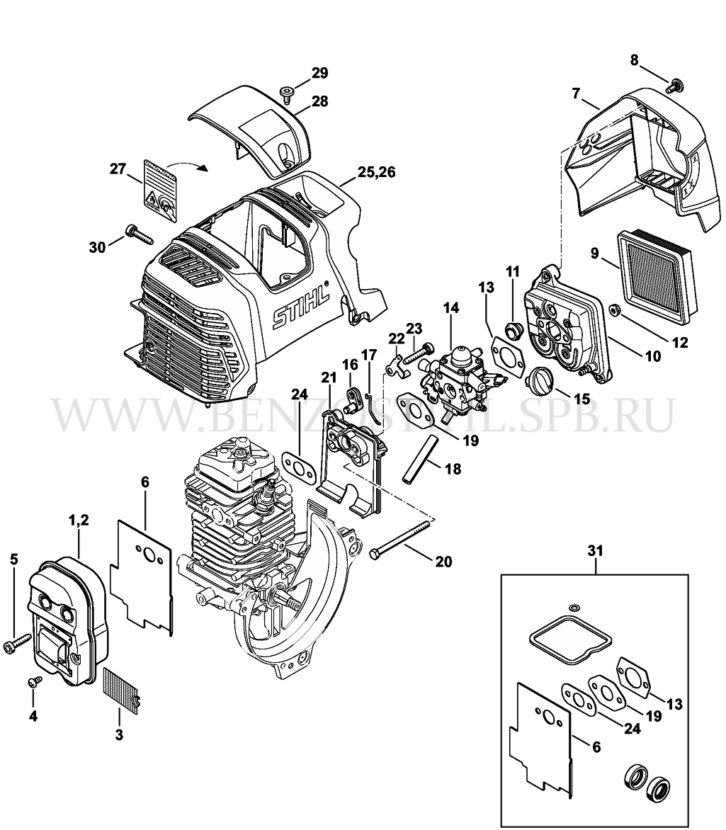 FS 111  Глушитель - Воздушный фильтр - Карбюратор